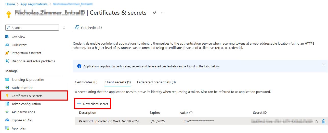 - Client Secret: This is the Secret Value copied earlier.